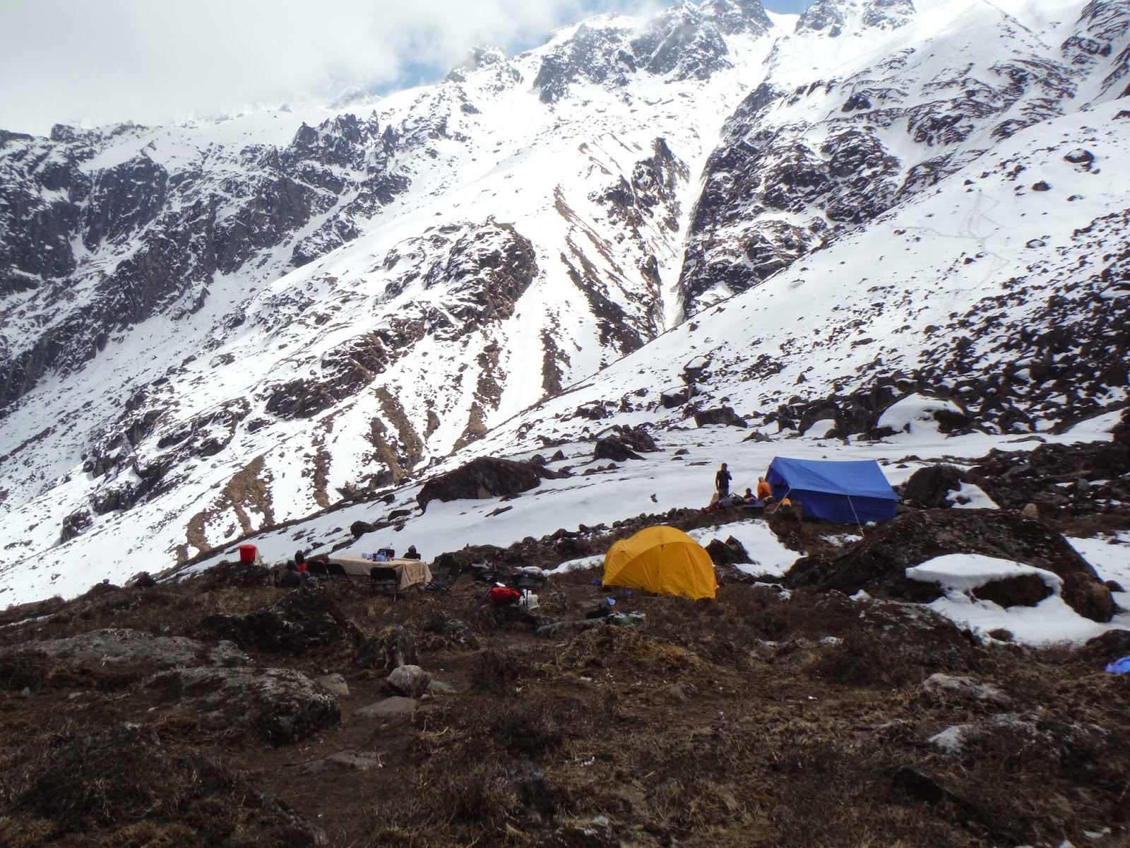 The final straw seems to be the steep slope up to our planned High Camp. We come across a series of the deep holes and finally get to a point where we can't find a way forward - I am now up to my chest in snow and even then falling down at times in holes between boulders! The rest of the group has now caught up and we decide to find somewhere to set up camp. We actually get a pretty picturesque spot in the end.