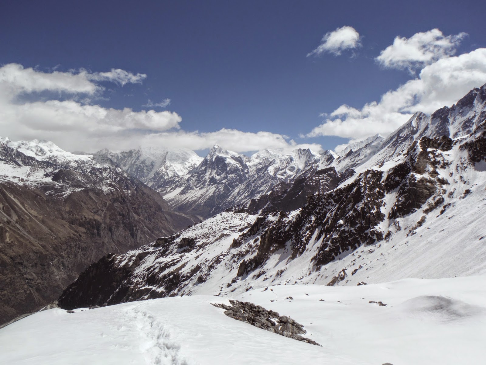 However, it soon becomes apparent that things aren't going to be so easy. There is only a very thin crust of snow on top of deep, soft snow so we are continually punching through which makes the going pretty slow. In addition the snow is on top of a boulder field so there are a number of invisible, big holes in between the boulders which we drop into as well. The lead Sherpa is pretty light so makes fairly decent progress along the ridges. I come next frequently punching through his footsteps and then convert the mess that I have made into solid footsteps for the porters coming behind me.