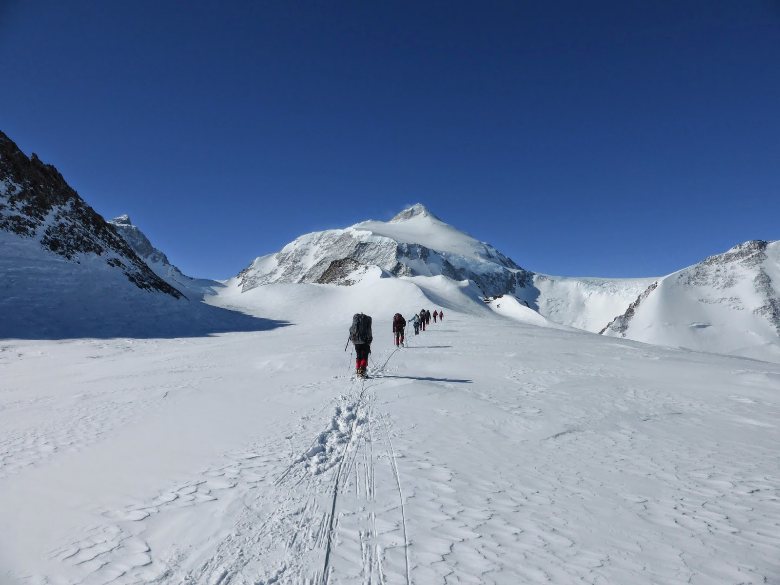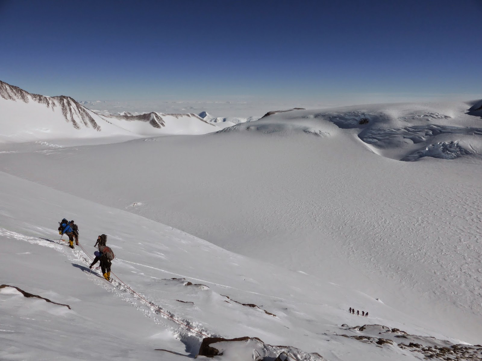 Finally we come to the Vinson peak and head left and up to come round the back. There, after about 3 hours, we see the summit through a break in the clouds which encourages everyone as well as heralding the start of a warmer spell and some superb views of the surrounding area.