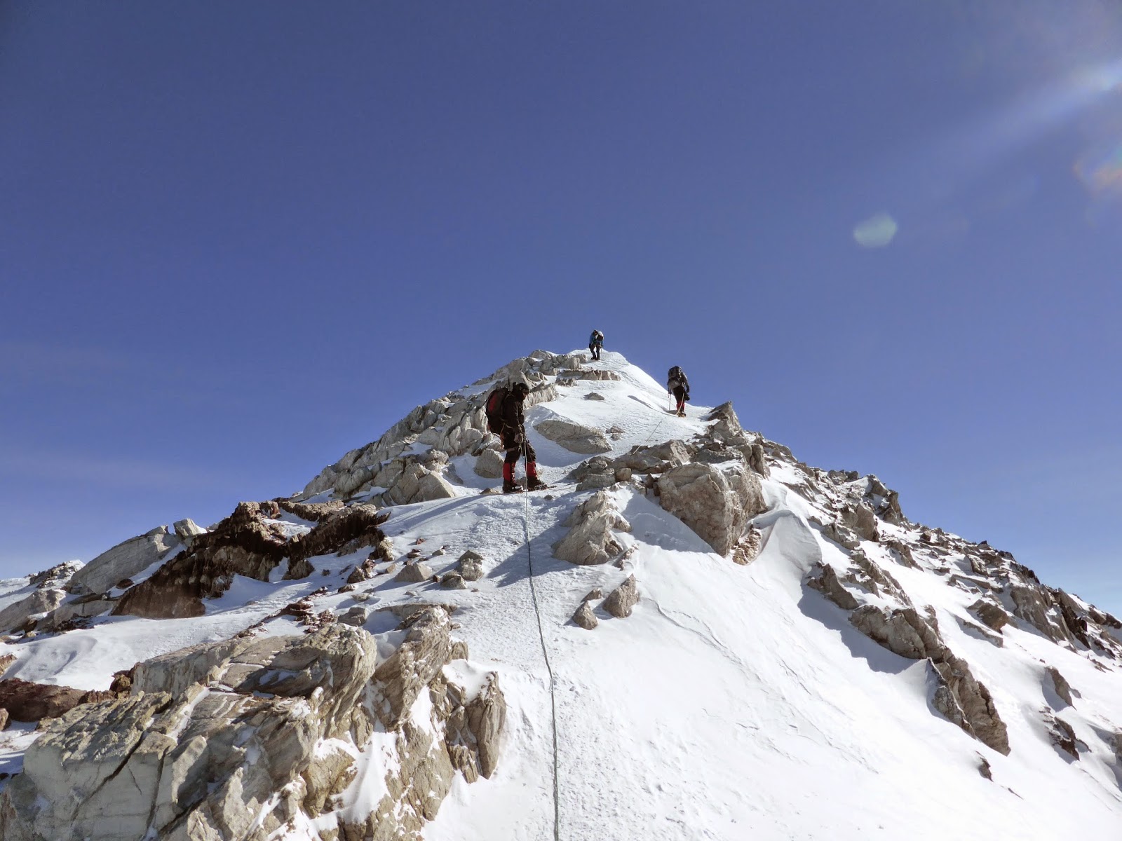 This is very exposed and windy but there are some enjoyable technical sections and great views. The summit ridge is pretty narrow in places and in a few places there we are right on the edge of huge drops when skirting round some of the rock outcrops along it - it is even windier out here which makes it pretty treacherous going. A slip here wouldn't be fatal in itself as we are all roped together but the cold and the wind means that any injury from such a fall would inevitably lead to significant problems (pretty much certain frostbite) before getting back to camp.