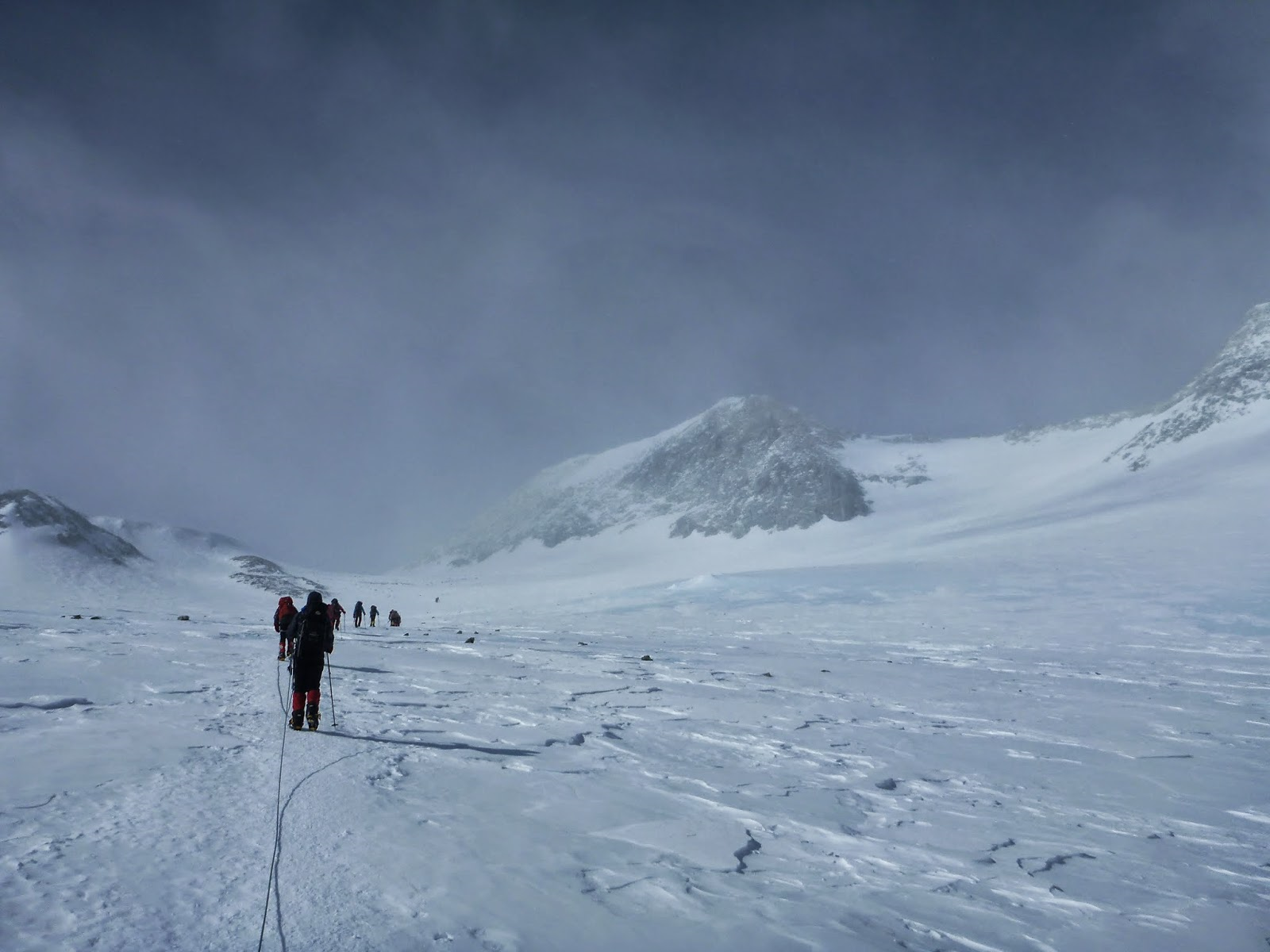 The weather deteriorates by the time we leave at 9 and we set off in the cloud and the cold - my concern over yesterday's decision is growing. We are also moving very slowly so it is pretty hard to stay warm or even enthused given that the clouds prevent any view to enjoy. There is a bit of a steep hill that takes us out of camp before we get onto a large flat plain followed by a steepish slope that seems to go on for ever - this is a mix of the speed at which we are travelling and the fact that we can't see any edges given the cloud which finally starts to lift.